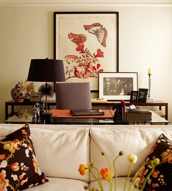 Instead of dissecting the wall just above the top of the window line, hang drapery just below the ceiling to draw the eye upward. This creates the illusion of height and space, as it keeps the eye moving.