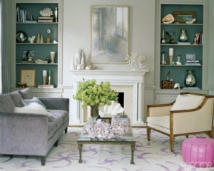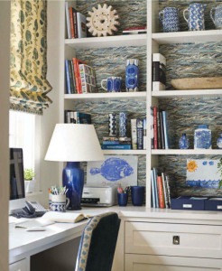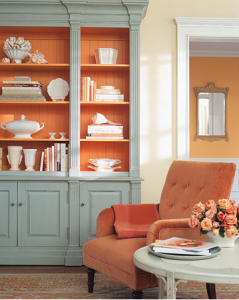 I frequently encounter homeowners who are afraid of color in large amounts, so integrating color onto the back of the bookcase is a safe alternative.