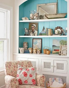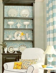 Wall covering, such as sea grass wallpaper or a print wallpaper, also works well to create visual interest behind the display pieces. However, it can also detract from the pieces and easily become too busy, so placing simple, un-patterned pieces on the shelves usually is best.
