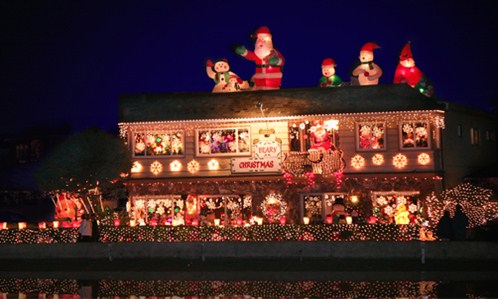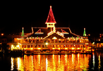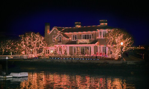 Accompanying this amazing sight are a dazzling array of decorated homes blanketing the different islands in Newport Bay:  Newport Island, Balboa Island, Little Balboa Island, Collins Island, Bay Island, Harbor Island, Lido Isle and Linda Isle.  Homes in this area range from small cottages to massive mansions and most are decorated to the hilt in competition for the Ring of Lights contest hosted by the Commodores Club of the Newport Beach Chamber of Commerce.  Homeowners and restaurants go all-out in a colorful, festive display featuring everything from roof-top animated scenes to dancing Christmas trees and thankfully, the City of Newport Beach photographs them, though these pictures don’t do them justice.