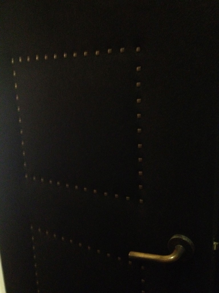 The office/second bedroom was dramatic and dark, with walls upholstered in caramel-colored velvet and a centerpiece of a lighting fixture, made from Velcro!