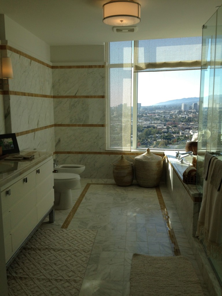 When I pulled up, I was shown through the gates and greeted by a full valet staff, then escorted through the full marble lobby to the elevators by a concierge. Everything gleamed, everything was new and the entire lobby smelled like fresh flowers! Candy Spelling lives in the building, so you know everything is amazing. Sponsored by The Hollywood Reporter, the rooms are Hollywood-inspired, which translates to drama and glamor high atop Los Angeles, with views from the Hollywood sign to my left, all the way out to the Pacific Ocean on my right, overlooking Fox Studios down below.