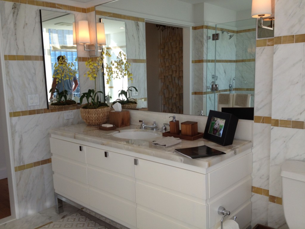 A high-rise will almost always dictate use of solutions to address pillars, and I think Joan Behnke did a wonderful job in the master bedroom here. This room almost had a tribal feel, with the drapery panels ‘wrapped’ in fabric at the top and privacy blinds in a beautiful, nubby fabric to play off the rug.