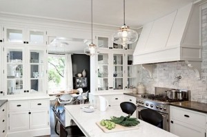 Another option for a small kitchen is to use upper cabinetry with transparent doors or simple open shelves (Ellen O’Neil)